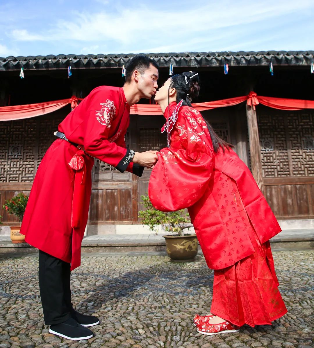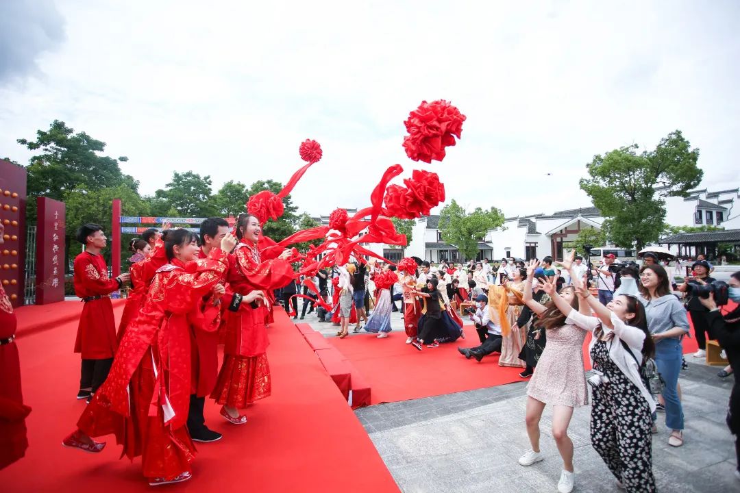 “一條紅絲綢,兩人牽繡球,月老定三生,攜手踏錦繡……”婚禮儀式在悠揚(yáng)的古琴聲中拉開序幕,新人們手牽紅繩款款而來(lái),跨過(guò)火盆,踩過(guò)米袋,踏過(guò)瓦片,寓意幸福生活紅紅火火、代代相傳。共拜天地、感恩父母、纏發(fā)絲、飲合歡酒、拋繡球……古老的儀式里,新人們共同許下一生的承諾,觀禮人員也為他們送上了最誠(chéng)摯的祝福。