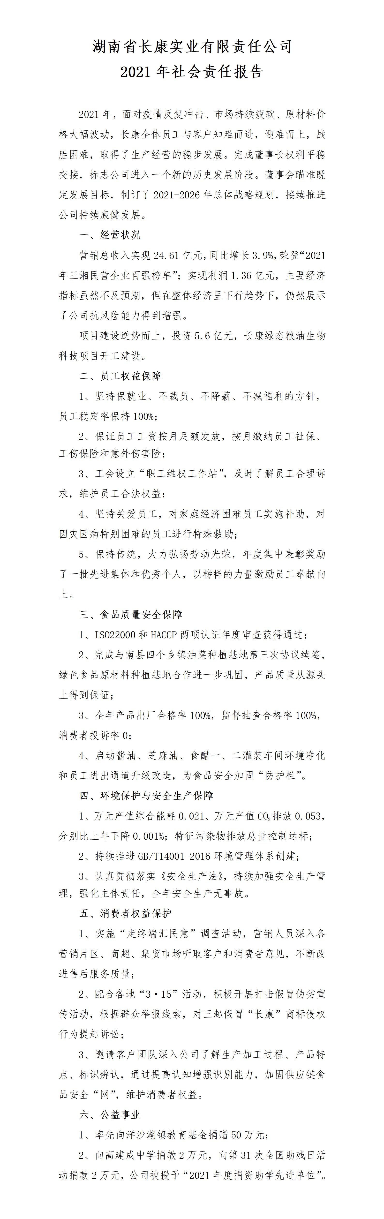 湖南省長康實(shí)業(yè)有限責(zé)任公司2021年社會責(zé)任報告